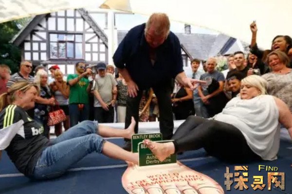 掰脚趾比赛听起来很精彩,但是这项运动从起源至今已经有近半个世纪的历史了。1976年,英国酒鬼乔治在极度无聊中创造了这个比赛。比赛要求参赛者扭动大拇指,把脚放在一个叫做“趾架”的小木架上。成功将对手的脚推到木架边缘木块上的人获胜。